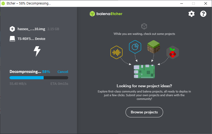 10. 이후 단계는 자동으로 진행이 됩니다. 먼저 HAOS 이미지파일의 압축을 푸는 과정(Decompressing)이 진행됩니다.