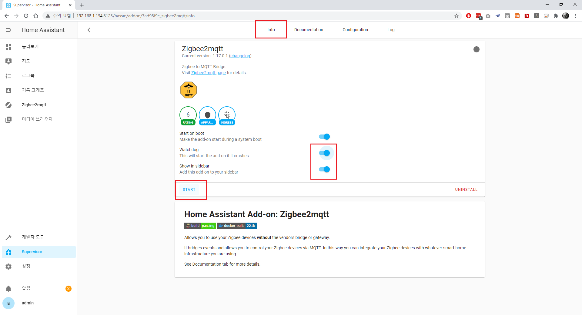20. 다시 [Info] 탭을 클릭하여, Watchdog과 Show in sidebar 옵션을 선택해줍니다. Show in sidebar 옵션을 선택하게 되면, 앞으로 자주 사용하게되는 메뉴인 Zigbee2mqtt 메뉴를 좌측 메뉴에서 빠르게 접근할 수 있습니다. 이후 [START] 버튼을 클릭하여 Z2M 애드온을 실행하여 줍니다.
