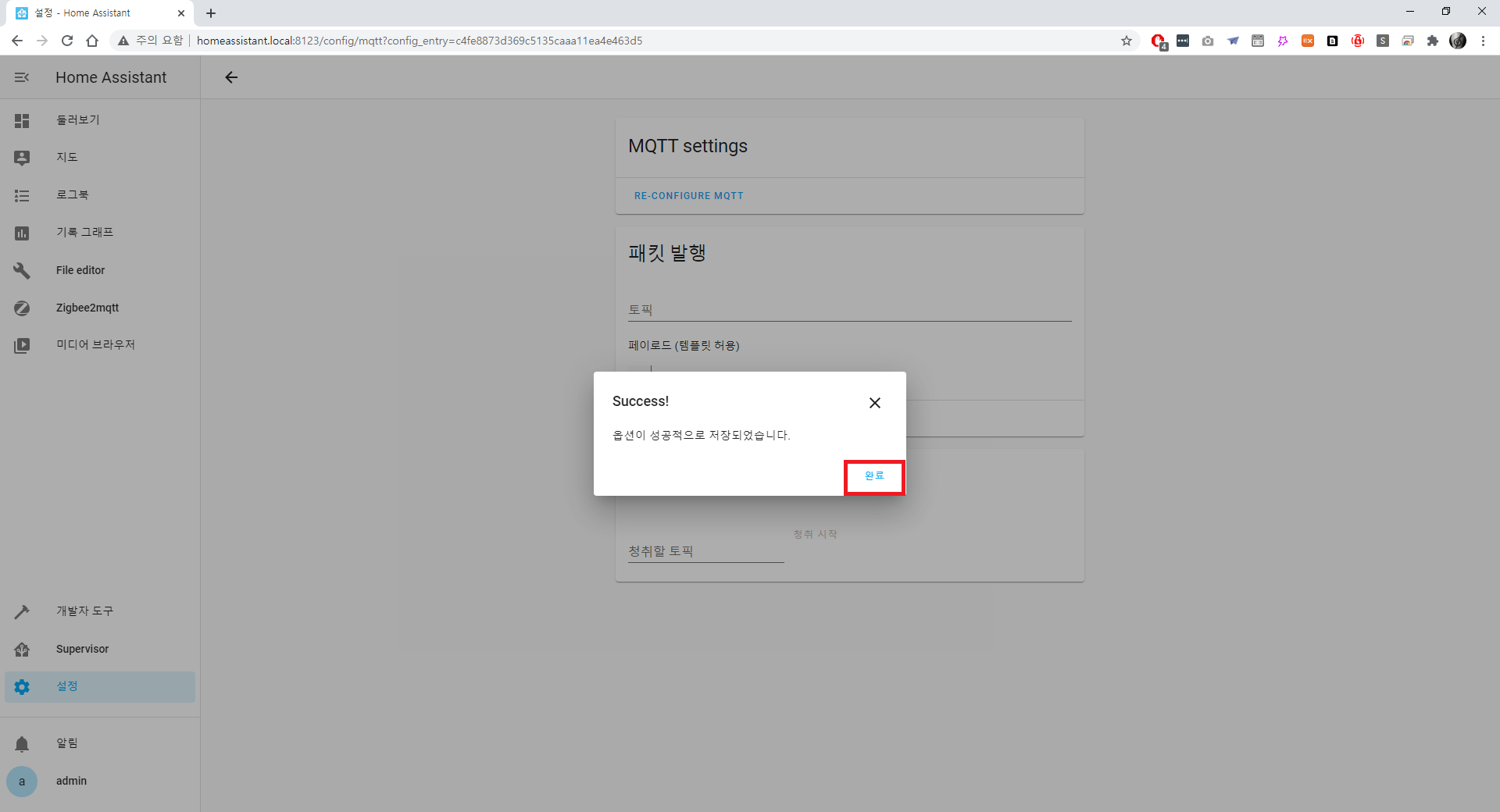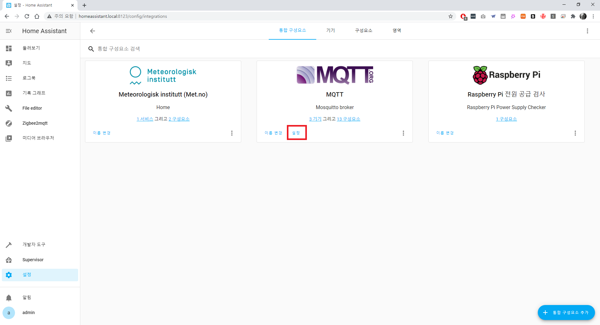 23. MQTT 통합구성요소 화면 카드에서, [설정] 버튼을 클릭합니다.