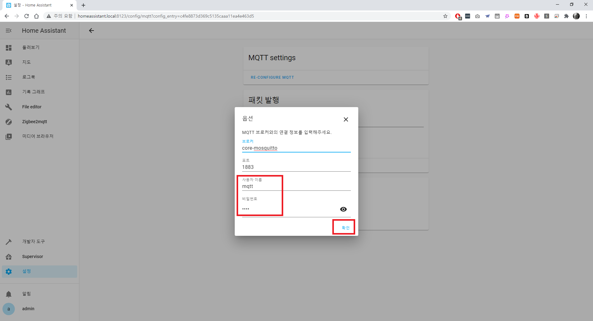 25. 팝업창에서 위 단계에서 추가한 MQTT 사용자 계정 정보를 입력해준 후 [확인] 버튼을 클릭합니다.