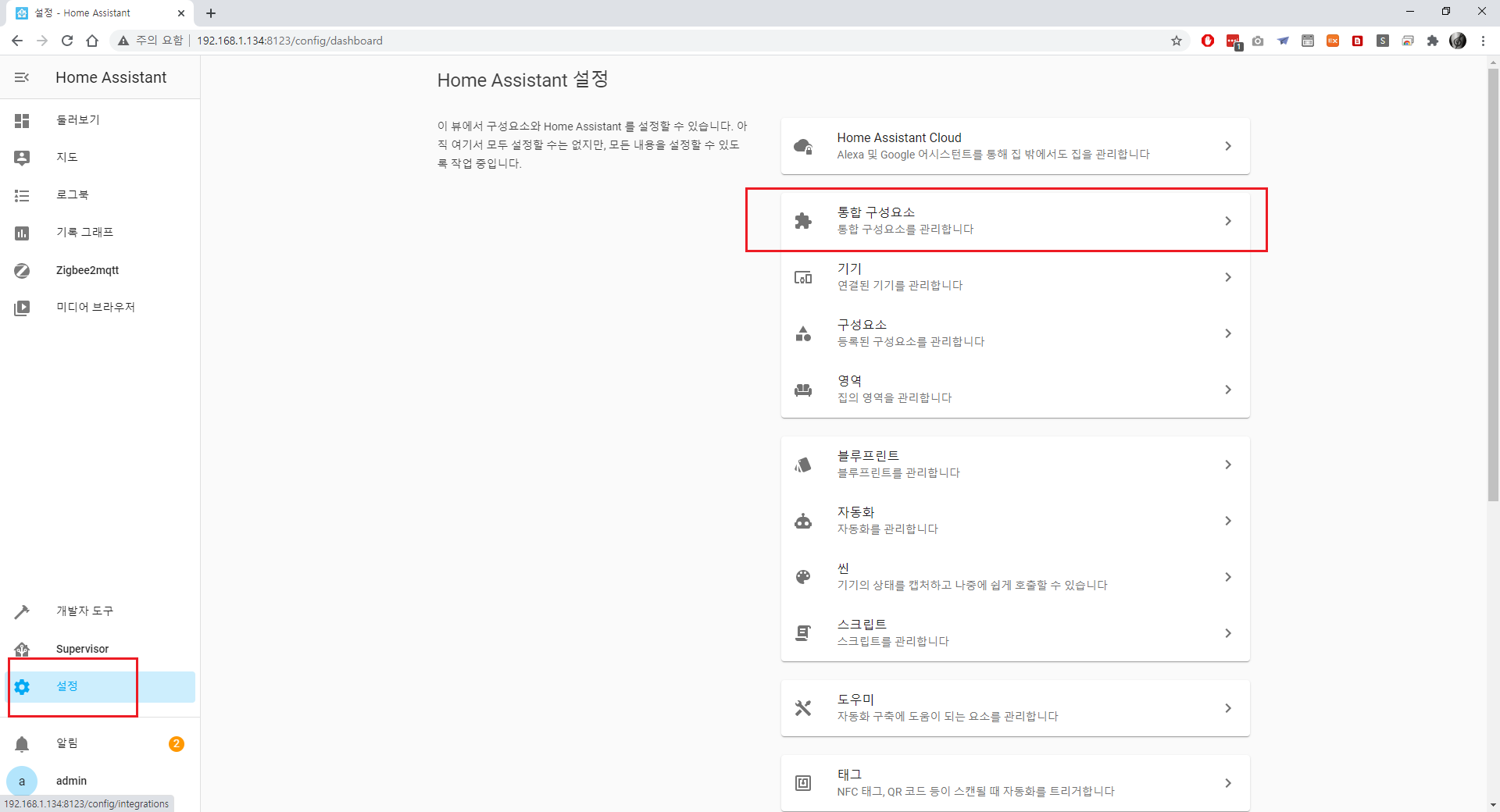 21. 이제 마지막으로 HA에서 Z2M에 연동된 지그비 디바이스를 자동으로 가져오기 위한 절차만 남았습니다. 좌측 메뉴 하단 [설정] 버튼을 클릭하여 [통합 구성요소]를 클릭합니다.