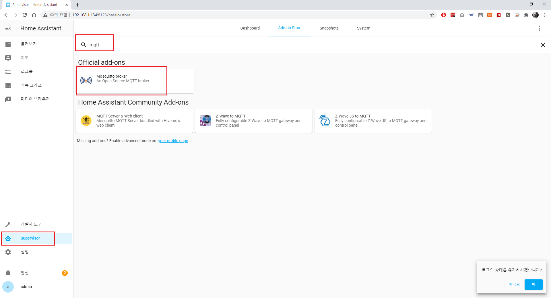 8. 이제 본격적으로 MQTT설정을 할 차례입니다. 먼저 MQTT 브로커를 설치합니다. MQTT 브로커는 간단하게 MQTT신호들을 총괄관리하는 서버개념으로 이해하시면 됩니다. HA 로그인 후 좌측 [Supervisor] 를 클릭 후, 상단 [Add-on Store]에서 [mqtt]를 검색합니다. Official add-ons에서 브로커인 [Moquitto broker] 를 클릭합니다.