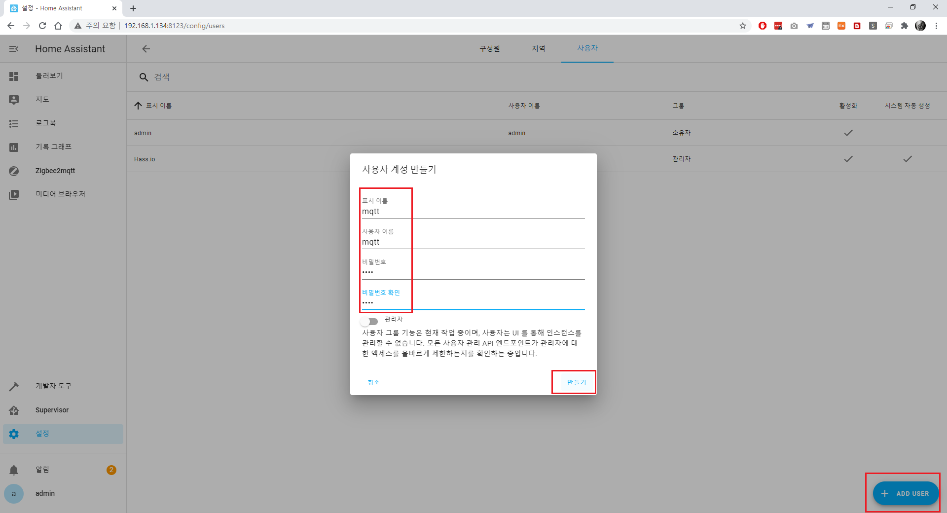 6. MQTT 브로커용으로 사용할 사용자 계정을 만들어줍니다. 제 경우에는 표시이름/사용자이름을 mqtt로 지정하였습니다. 사용자이름(ID)와 비밀번호(PW)는 앞으로의 설정에 사용되니 기억해주시기 바랍니다. 이제 [만들기] 버튼을 클릭하여 MQTT용 사용자 계정을 생성해줍니다.