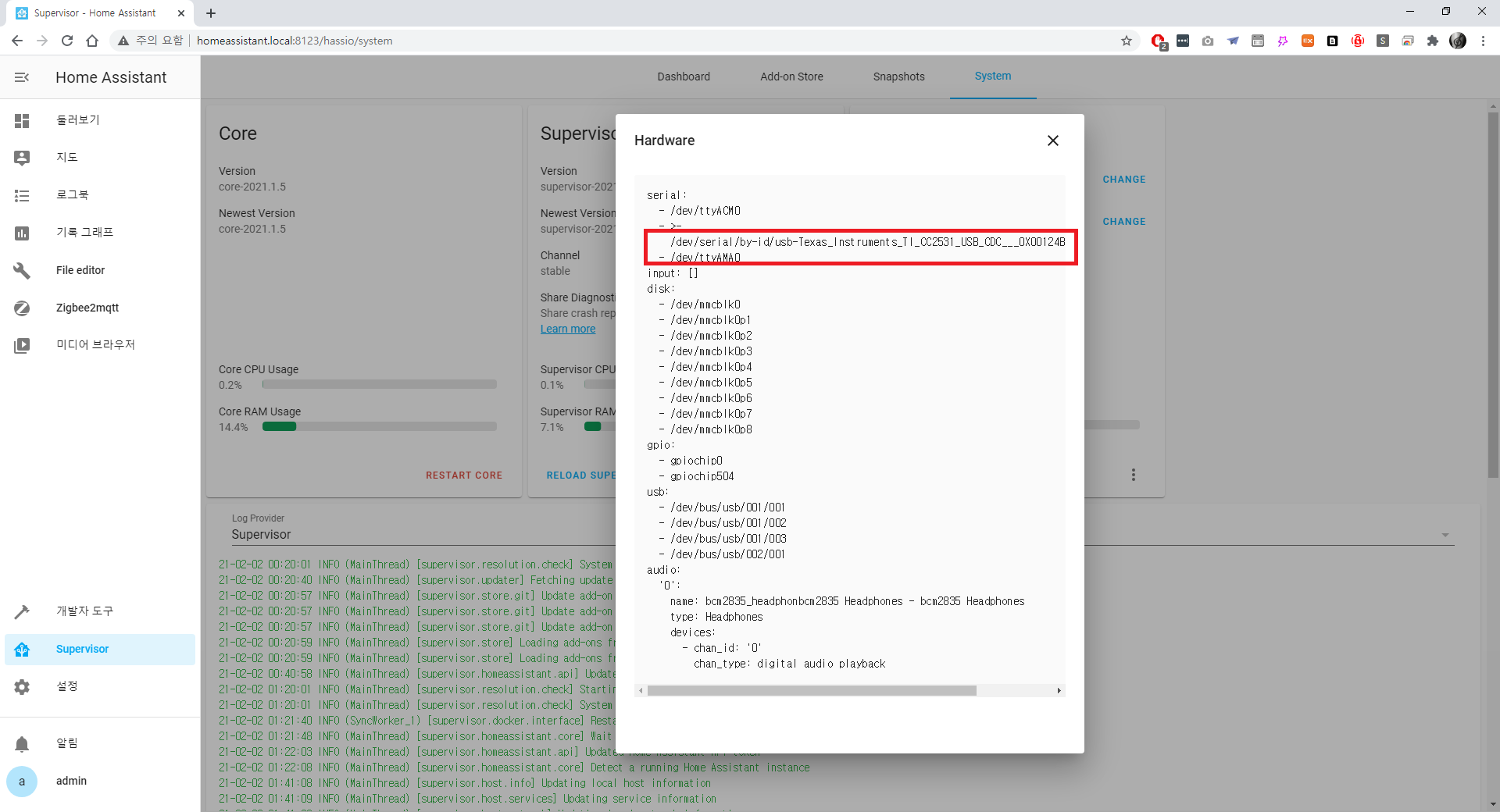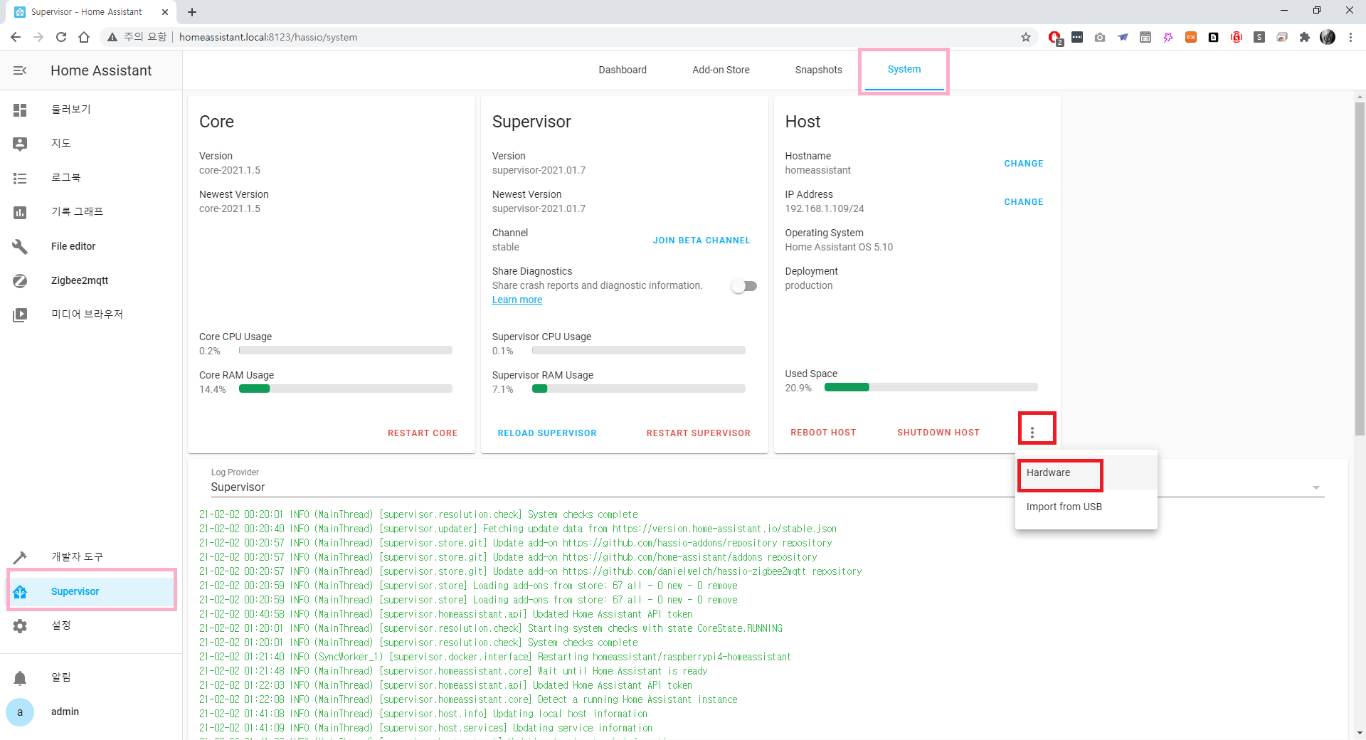 2. 인식이 제대로 되었는지 확인하기 위해서는 HA 로그인 후 좌측 메뉴에서 [Supervisor] 클릭 후 우측 상단 [System]을 클릭 후에 Host 탭에서 [...] 을 클릭 후에 [Hardware]를 클릭해줍니다.