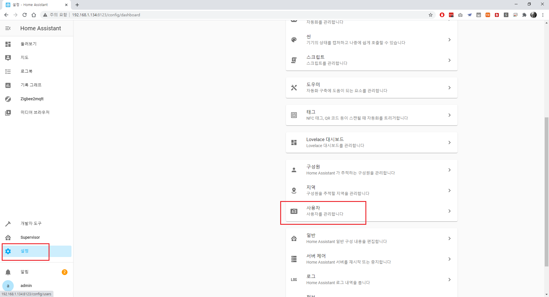 5. 이후, 좌측메뉴 [설정] 을 클릭하여 스크롤을 좀 내리면, [사용자] 메뉴가 활성화 된것을 확인할 수 있습니다. (위에서 고급모드를 활성화 하지 않으면 사용자가 보이지 않습니다.) 활성화된 [사용자] 메뉴를 클릭해줍니다.