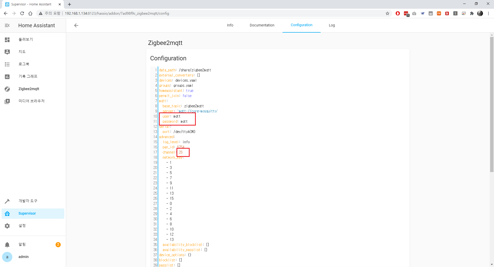 18. 설치가 완료되면 [Configuration] 탭을 클릭하여, 아래 이미지를 참고하여 user, password 정보를 위의 단계에서 설정한 MQTT 사용자 계정 정보(user, password)로 입력하여 줍니다. 추가로 advanced에서 지그비 채널값을 변경해줄 수 있는데 기본값11채널은 와이파이 2.4기가 영역에서 중복되어 통신지연/누락 현상이 있을 수 있으므로, 원활한 통신을 위해 25채널로 변경하여 줍니다.