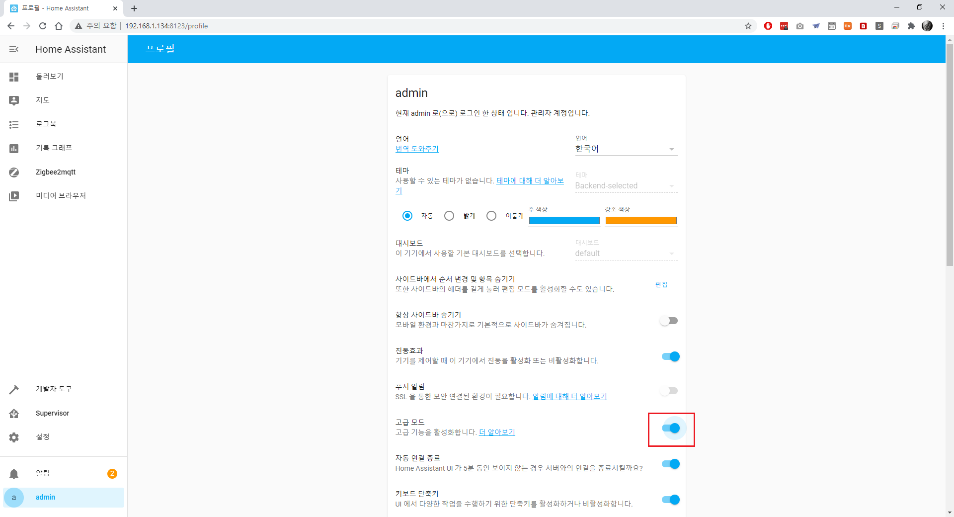 4. 연결 된것을 확인하였으므로, 이후 단계 진행을 위해 HA의 고급모드를 활성화해보겠습니다. 좌측 하단의 사용자 이름(여기서는 admin)을 클릭하여 프로필 화면으로 가보면, 그림과 같이 고급모드를 설정하는 토글 버튼이 있습니다. 이것을 체크하여 활성화해줍니다.