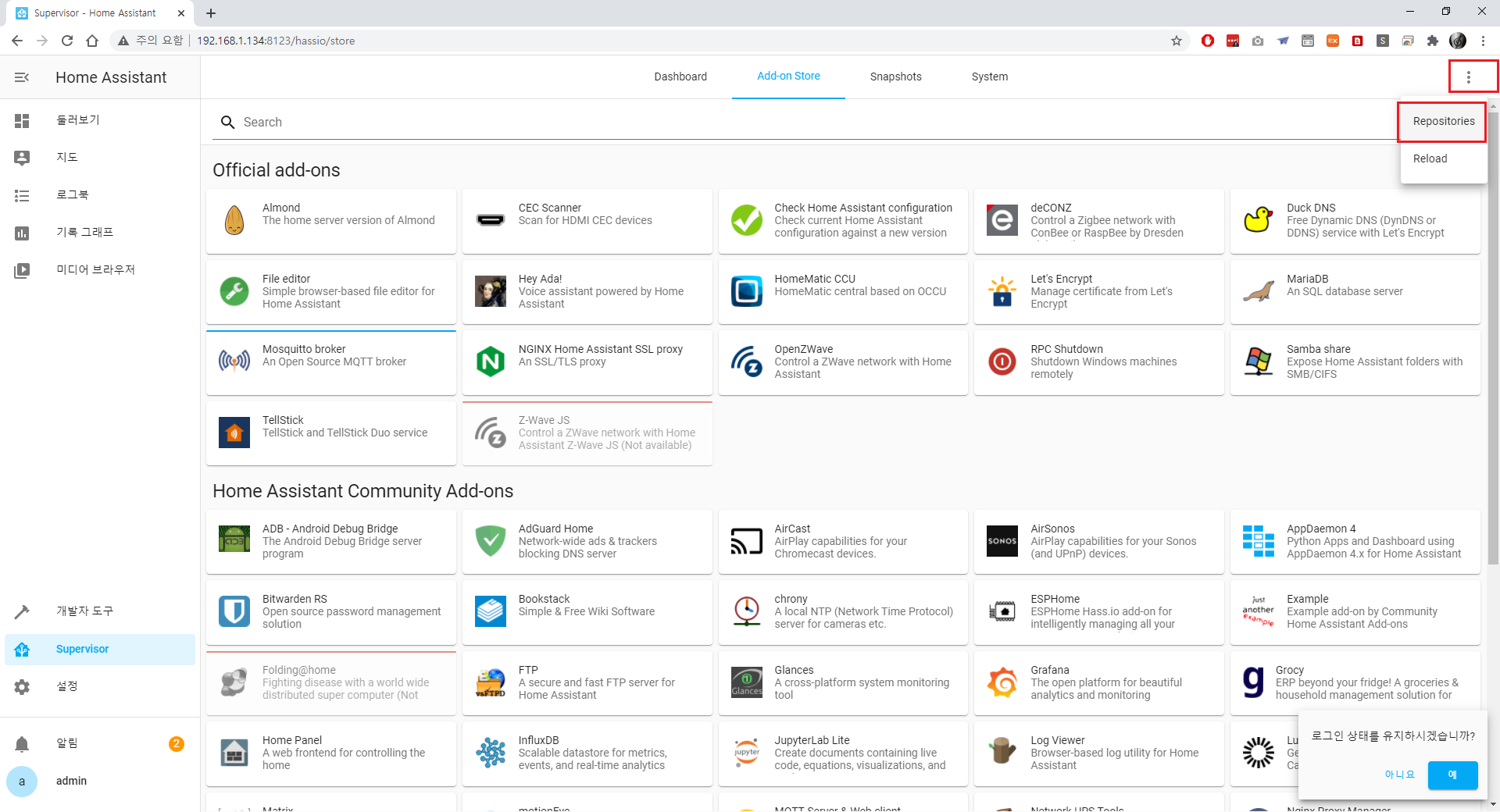 13. MQTT브로커를 설정완료 하였다면, 이제 Z2M을 설치할 차례입니다. Z2M은 Zigbee2MQTT에서 관리되는 지그비 정보들을 MQTT로 보내주는 역할을 수행합니다. 또한, 앞으로의 Zigbee장비를 추가하는데에도 사용되는 애드온입니다. 좌측 메뉴의 [Supervisor] 클릭 후, 우측 [Add-on Store]를 클릭한 후에 우측 상단의 [...] 버튼을 클릭하여 [Repositories] 버튼을 클릭해줍니다. 이는 Zigbee2MQTT 애드온이 별도 github저장소에서 관리되기 때문입니다.