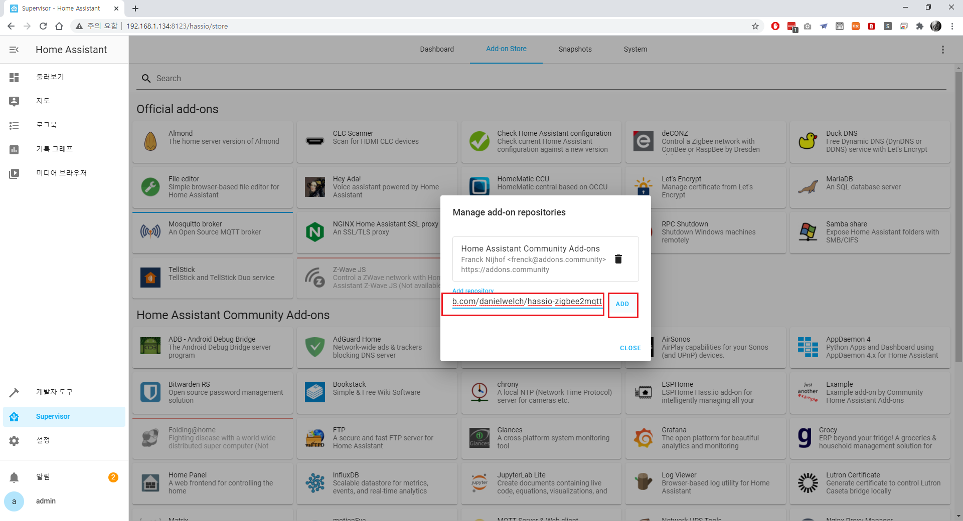 15. Zigbee2MQTT 저장소가 추가된 것을 아래 그림과 같이 확인 후 [CLOSE] 버튼을 클릭합니다.