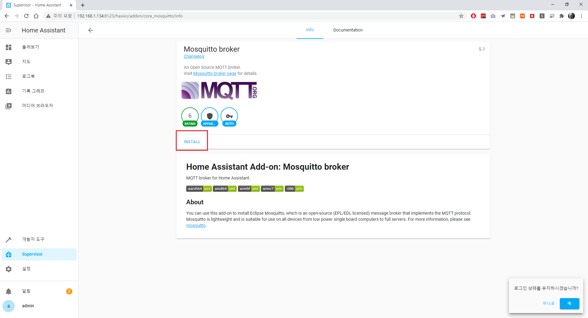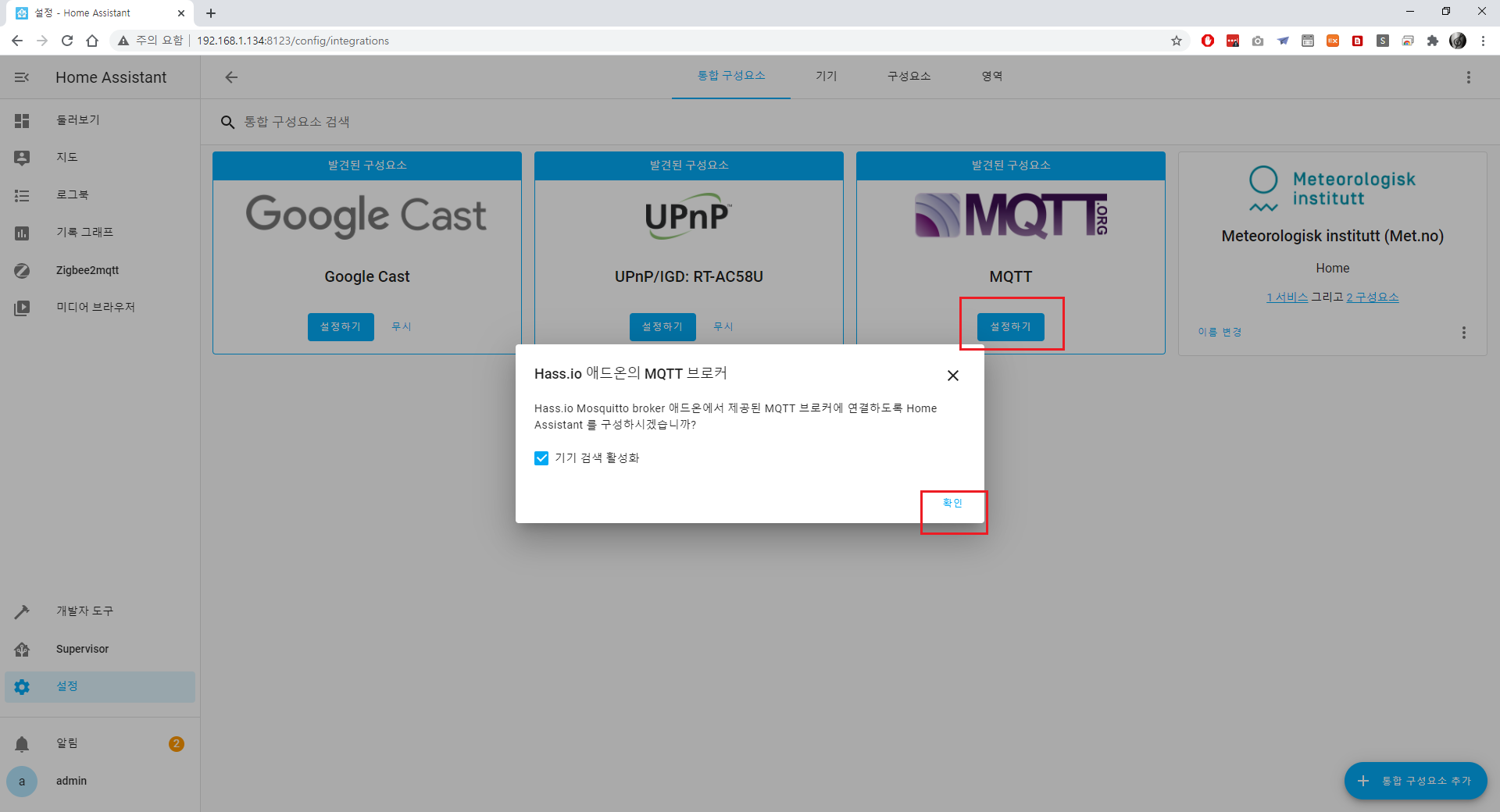 22. 발견된 구성요소에 MQTT가 보이는것을 확인할 수 있습니다. [설정하기] 버튼을 클릭한 후 팝업창에서 [확인] 버튼을 클릭합니다.