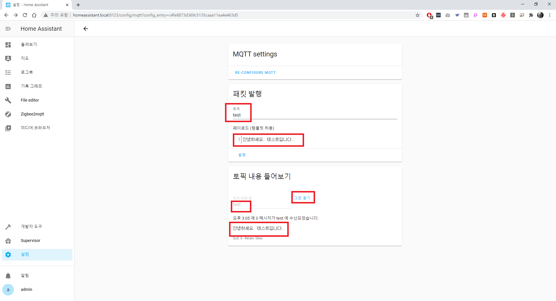 28. 정상적으로 MQTT 통신이 되는지 확인하기 위해, 하단 토픽 내용 들어보기에서 [청취할 토픽] 란에 [test]를 입력 후 [청취 시작] 버튼을 클릭합니다. 상단의 패킷 발행 부분에서 토픽란에 [test]를 입력 후 페이로드 칸 숫자 1 옆에 아무글자나 입력하여 [발행] 버튼을 클릭해봅니다. 아무글자나 입력한 내용이 토픽내용 들어보기에 나타나야 정상적으로 MQTT 설정이 완료된 것입니다.