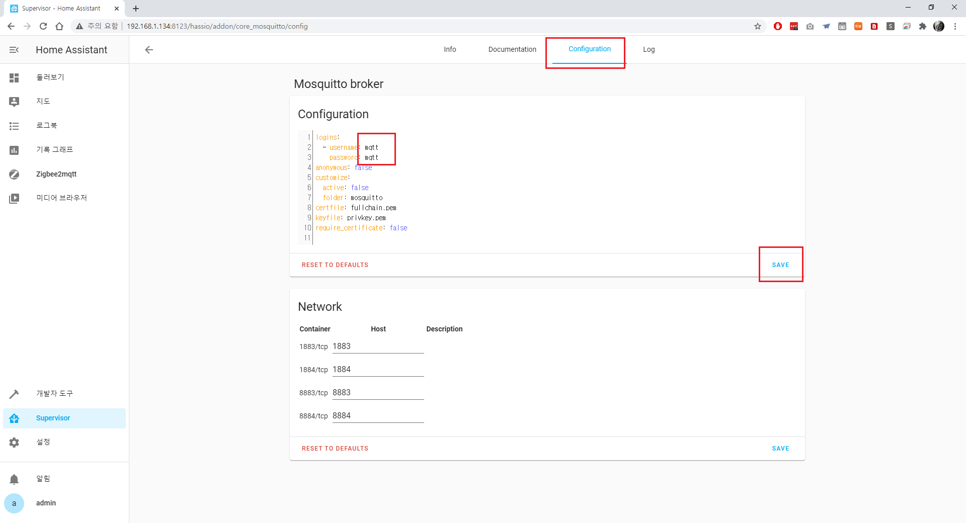10. MQTT 브로커의 환경설정이 필요합니다. 설치완료 후 우측 상단의 [Configuration] 탭을 클릭하여, 다음 이미지를 참고하여 username과 password를 추가한 MQTT사용자 계정에 맞게 설정해준 후 [SAVE] 버튼을 클릭해줍니다.