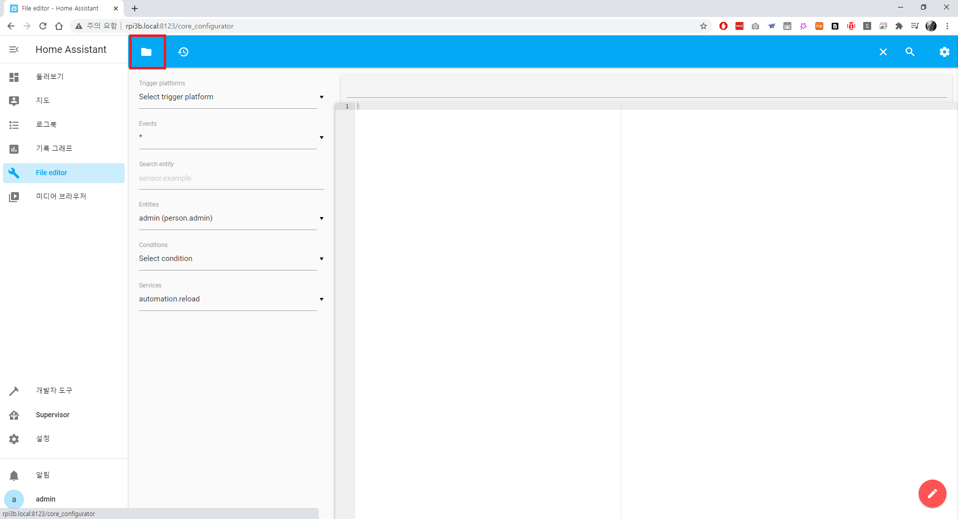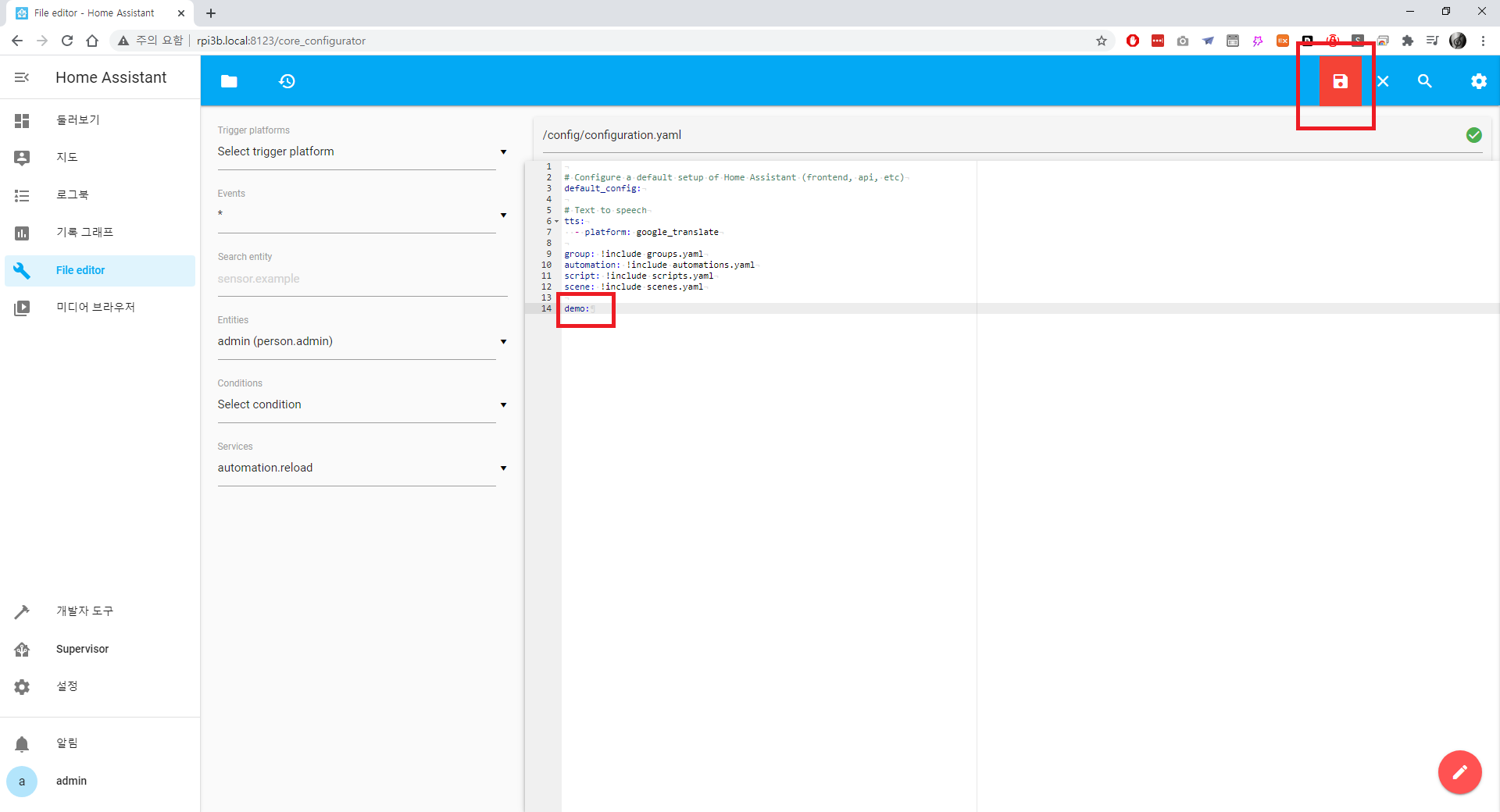 이후 우측 상단의 디스켓모양 [저장] 버튼을 클릭하여, 변경사항을 configuration.yaml파일에 저장하여 줍니다.