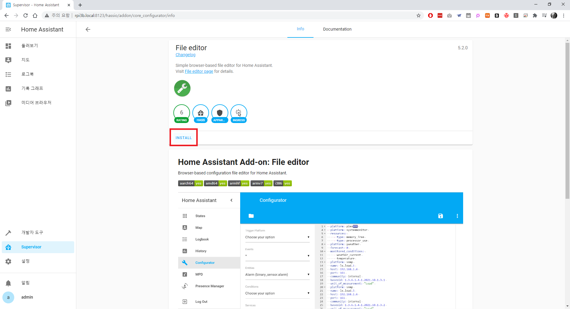 2. [INSTALL] 버튼을 클릭하여 File editor를 HA에 추가하여 줍니다.