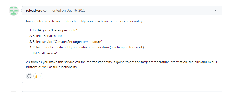 버그사항으로 보이며, 각 climate entity당 1회씩 수행하면 다시 온도 컨트롤이 가능해짐을 확인할 수 있었다.