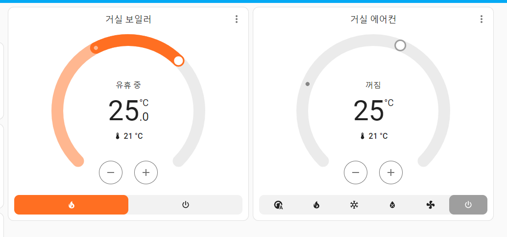 기존 Home Assistant 커뮤니티에서 불만사항 중 하나인, 현재온도와 목표설정온도가 직관적이지 않다는 UI를 개선하여 시안성이 좋아졌다.