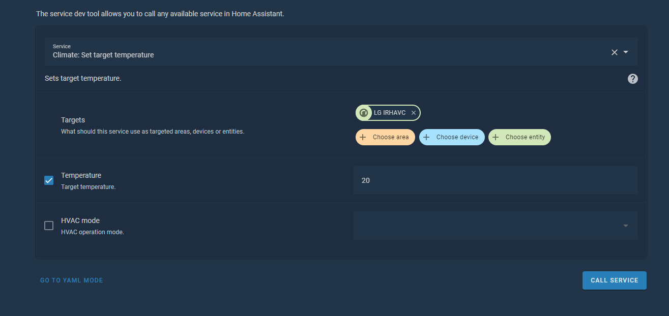 4. (영문) +Choose entity 클릭하여, 온도조절이 되지 않는 climate entity 선택, Temperature 체크 후 온도를 임의의 값으로 지정 후 CALL SERVICE 클릭